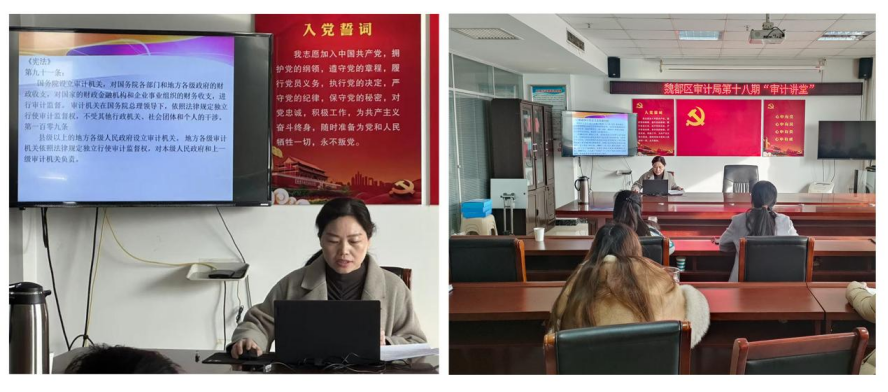 为深入贯彻落实习近平法治思想,进一步增强干部职工的法治意识和依法审计能力,魏都区审计局举办第十八期审计大讲堂,宣传解读《中华人民共和国宪法》。主讲人结合财政审计的政策落实、预算执行、绩效管理等方面,全面讲解与高质量发展密切相关的法律法规,并重点讲解了宪法赋予审计机关的职责、审计机关权限、审计程序、法律责任等方面内容。