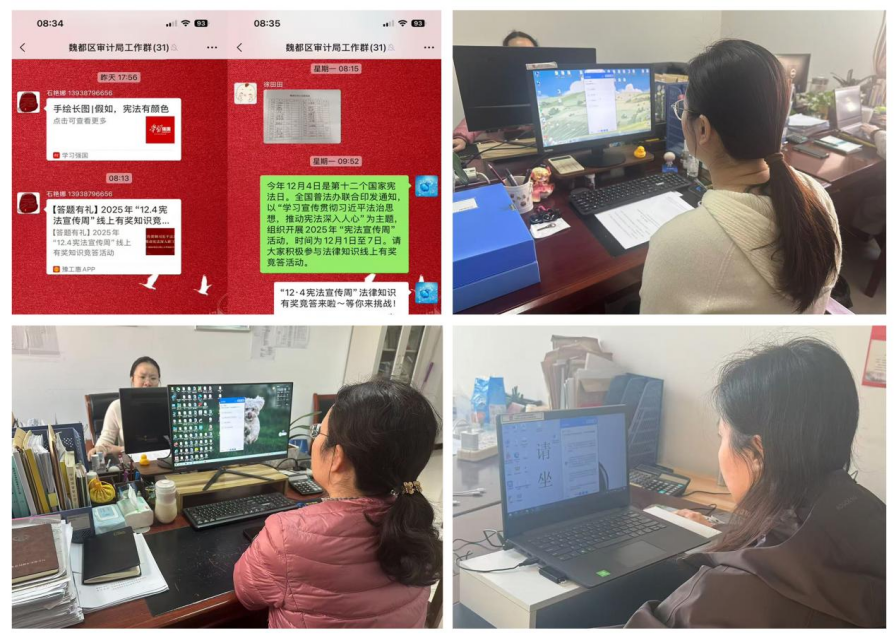 在第十二个“国家宪法日”暨第八个“宪法宣传周”期间,魏都区审计局充分利用“法润许昌”和“魏都普法”微信小程序,动员全体机关干部参与“12·4宪法宣传周”法律知识有奖竞答活动,以赛促学、以学促干,持续提升全体审计干部的法律素养,为依法审计工作的高质量开展奠定了坚实基础。(起草人:叶亦青 审核人:庞东华)